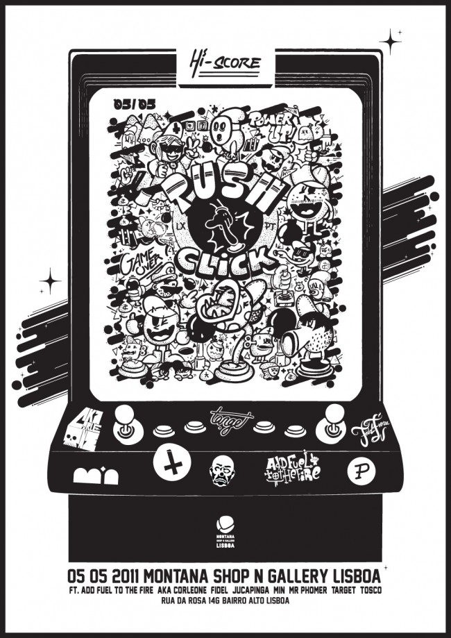 Add fuel to the fire, akaCorleone, Fidel, Jucapinga, Min, Phomer, Target e Tosco, começam assim a primeira ronda de “Push-Click”. São gamers, são artistas e juntam-se para apresentar trabalhos originais, edições limitadas em serigrafia, jogos e acessórios… do tempo em que tudo tinha menos definição e menos pixeis.
