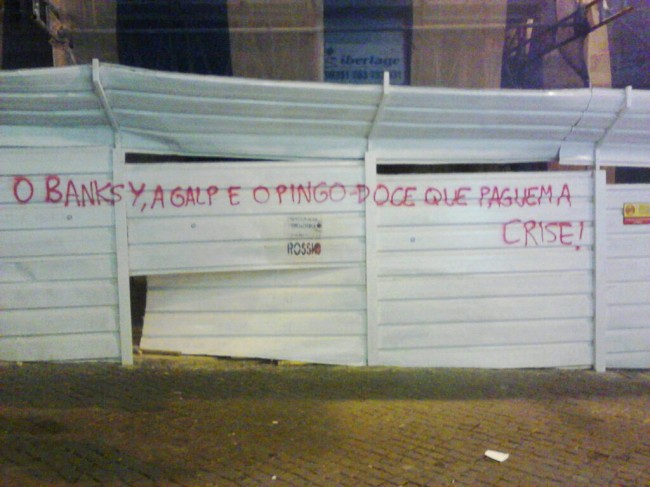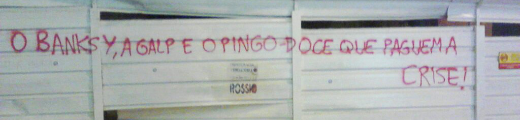 While navigating around the inter-webs social medias, just found this pic that really made me laugh. Translate into “Let Banksy, Galp and Pingo-Doce pay for the crisis!”. Unkown author. By Haize.