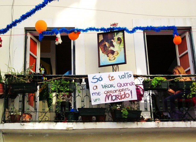 Again, what better to find on the streets if not the thoughts of the neighborhood people. Today is Santo António’s day, which if you’re not Portuguese might not be familiar with. Santo António is like the “cupid saint” or “matchmaker” of Portugal. This is probably the biggest party in Lisboa throughout the year, which starts right the night before, with the famous “marchas” of the neighborhoods going down the avenue, and basically everybody is out on the streets eating sardines and partying. This pic, shows the good humour in the balcony of a Portuguese woman.