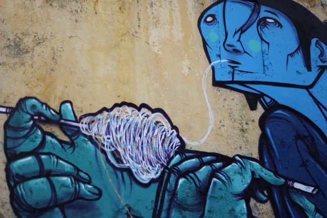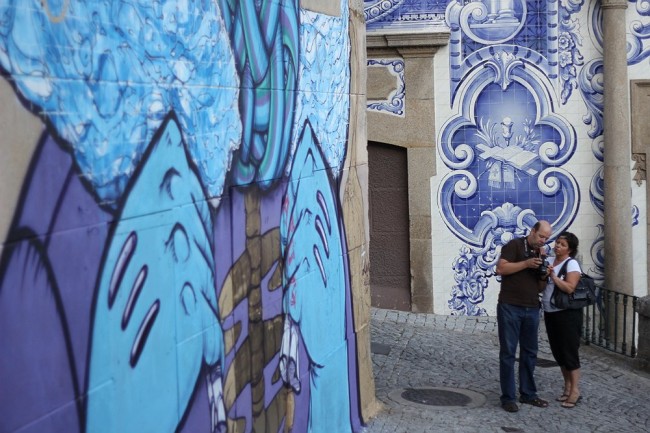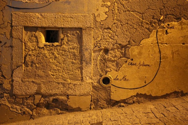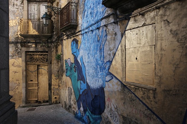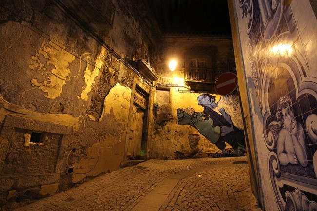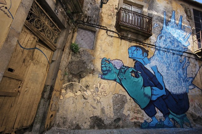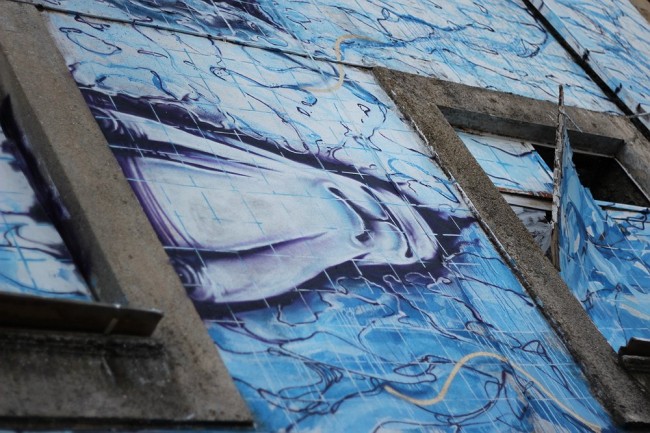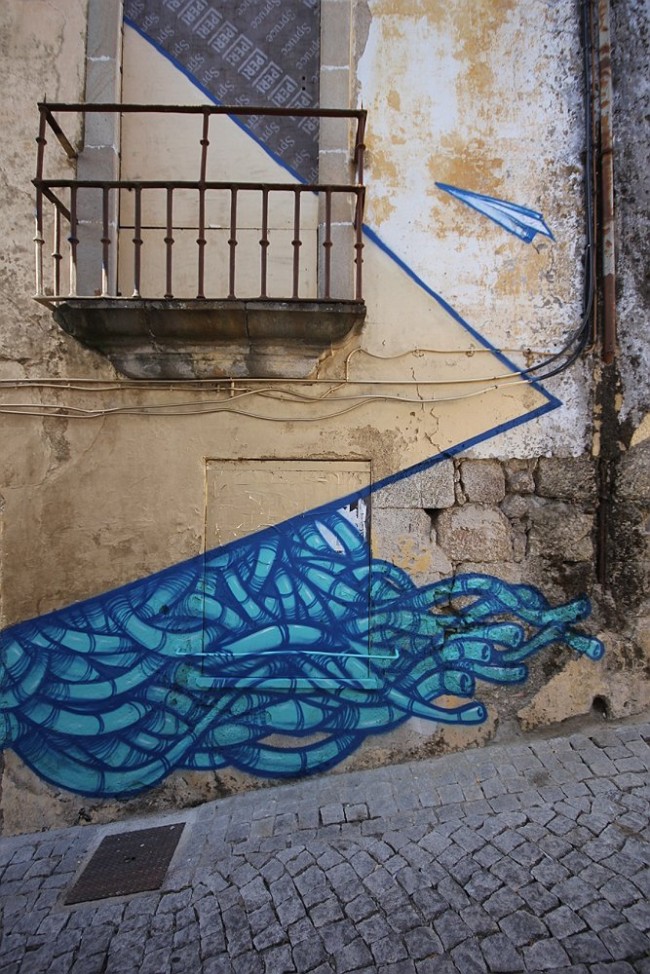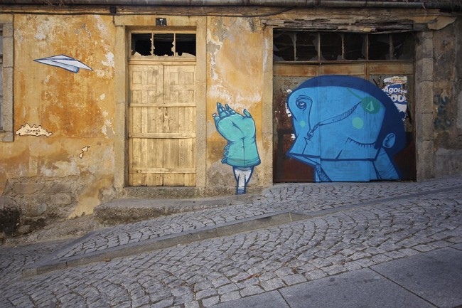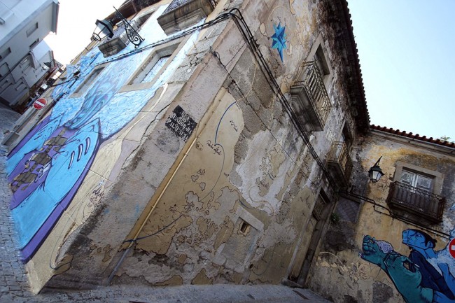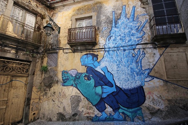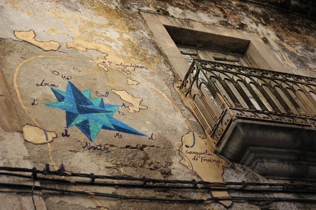 The WOOL festival has finished it’s first event, with the ARM collective spending some days in Covilhã painting night and day. Locals would stop by everyday to enjoy the developing of the main piece. They have taken in to account the surrounding church when painting their main piece, and that is visible by the illusion of tiles (Portuguese azulejo) used to blend in with the church’s near façade. Along the side walls, there’s also visible some small annotations, lost like a treasure map with small words of sayings and ways to pronounce words in Covilhã. All in all, probably the best ARM collective work I’ve seen so far and the best way to kick off a festival. All pics have been taken by Pedro Seixo Rodrigues, one of the mentors of the project. Enjoy…
