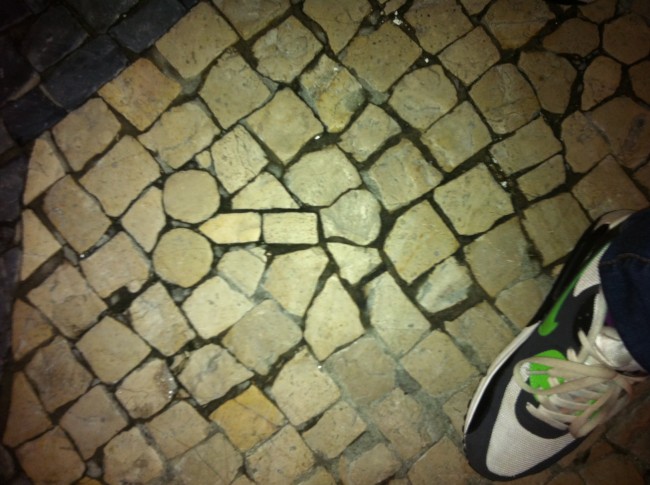 By the colour tone of the stones, I can’t really tell if they were set prior or after the original laying out. And if this is not a coincidence, it makes me think that the street artist mat be a graphic designer, a fine artist, an interventionist… OR he/she may be a simple “calçada” worker laying out subliminal messages during the day.