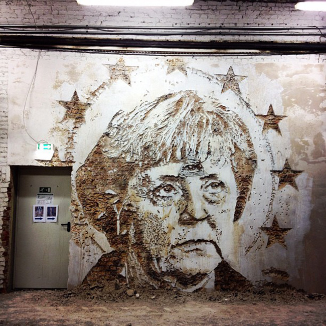 A new piece by Alexandre Farto aka Vhils to end the year, which has been getting lot’s of feedback back on the facebook page. Vhils made this portrait of German chancellor Angela Merkel, leaving her with a third eye, a reference to the “eye of providence” related to the latest Euro crisis, that’s been taking the news. One of his best pieces of the year, with the inclusion of several elements to the portrair rather than the usual etched face.