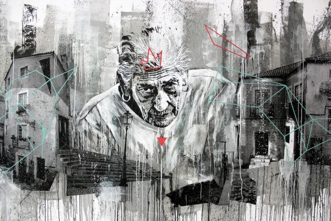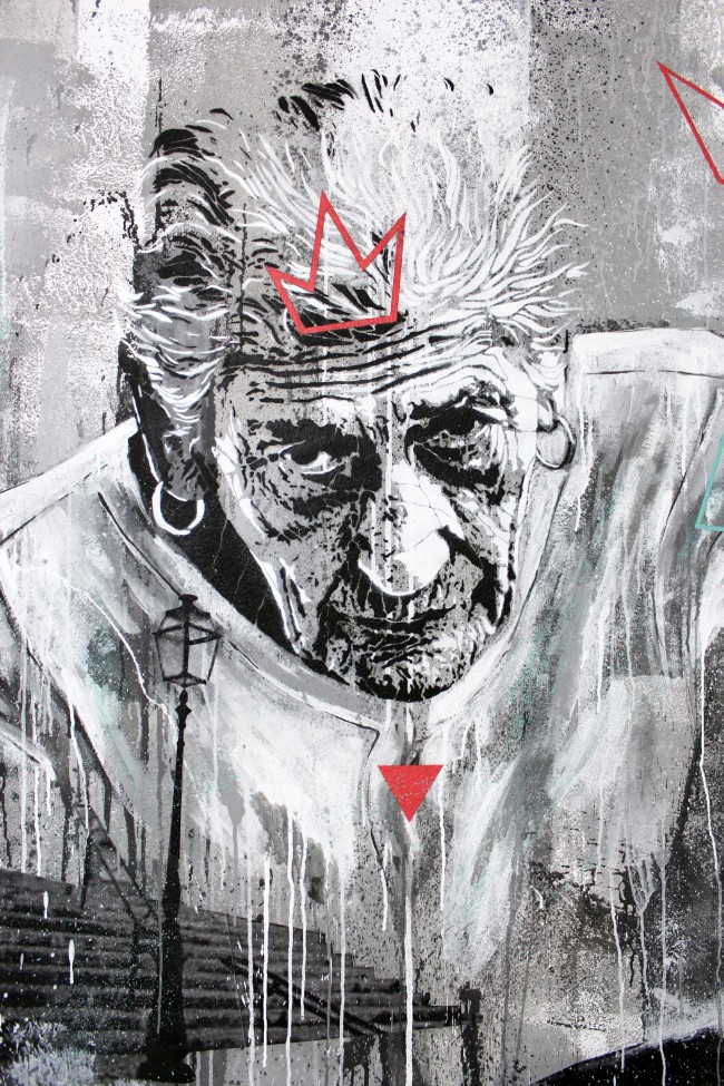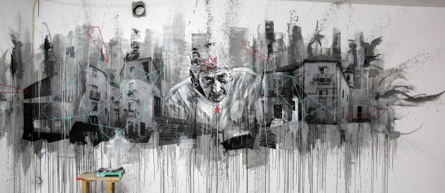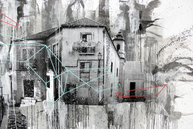 Work in Progress Garrett is a platform that has been receiving artists for the past weeks, working on several rooms for the period of a week. João Samina was one of the artists, leaving a big stencil wall in one of those spaces.