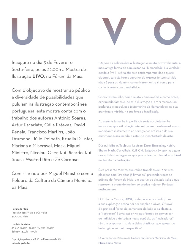 Coming this friday, is the illustration collective show “UIVO” with a huge amount of talented artists to Fórum da Maia. The list contains António Soares, Artur Escarlate, Célia Esteves, David Penela, Francisco Martins, João Drumond, Júlio Dolbeth, Kruella D’Enfer, Mariana a Miserável, Mesk, Miguel Ministro, Nicolau, Oker, Rui Ricardo, Rui Sousa, Wated Rita and Zé Cardoso. Flyer and teaser video inside.