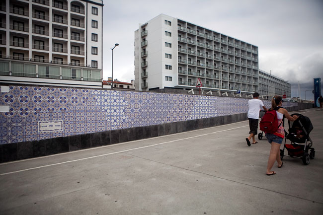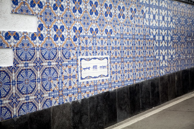 As part of the Walk & Talk festival, Diogo Machado aka Add fuel to the fire had quite a job filling in this massive 30m long wall with his tiles. Diogo says: “this azulejo (ceramic tiles) mural consists of five independent modules that create an apparent sense of deconstruction throughout the entire piece. Like all of my azulejo work, it requires a closer look as it reveals that all the five modules connect between themselves and create a ‘disguised unity’.”. While there, he still got some tiles up in the streets, so expect a post with those soon.