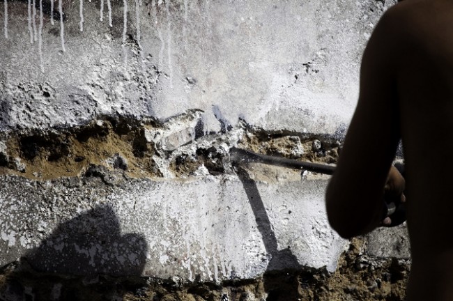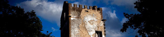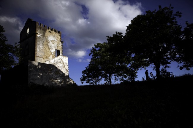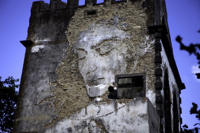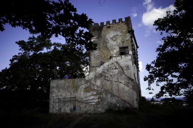 Vhils went on a flash operation, doing this new piece in less than three days working day an night, at an abandoned tower, in Açores for the Walk & Talk festival. The piece is entitled “Abraçar a ruína” (embrace the ruin).