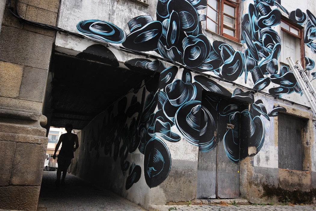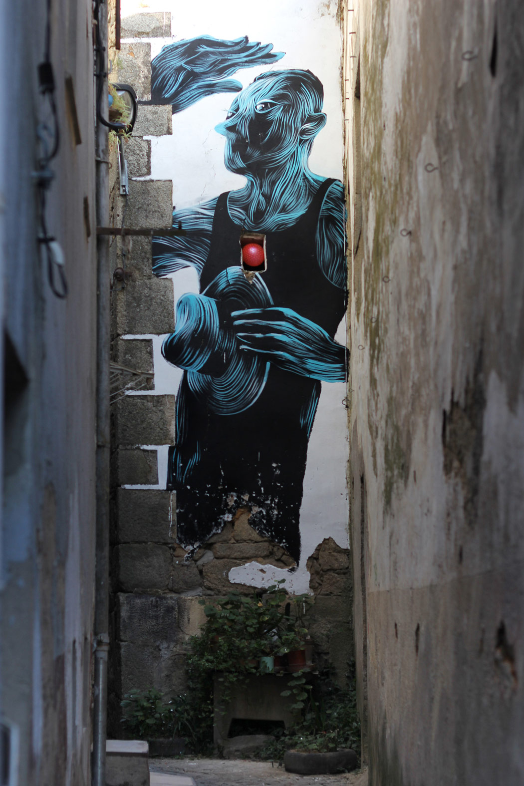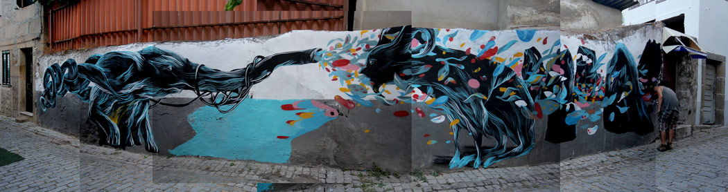 Thanks to WOOL, Pantónio has created one of the most beautiful pieces this year for CALE, a festival dedicated to all kinds of arts that happen in the street. Pantónio executed 3 murals along the main street of the historical center in Fundão, where the festival takes place. The beautiful shots were captured by Pedro Seixo Rodrigues.