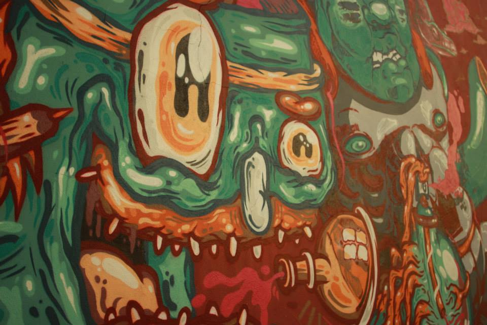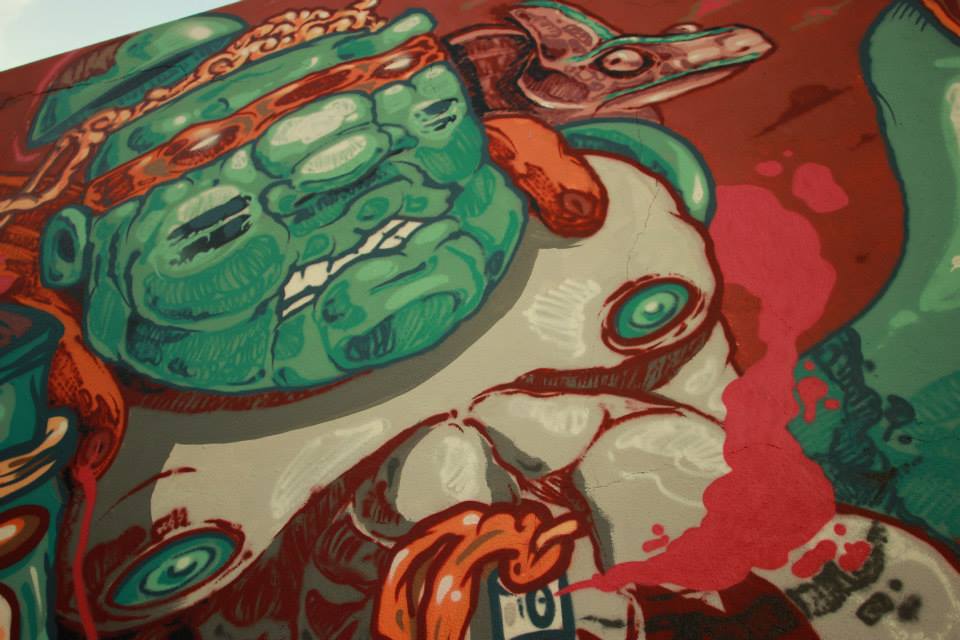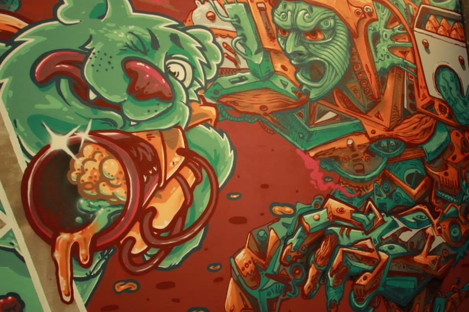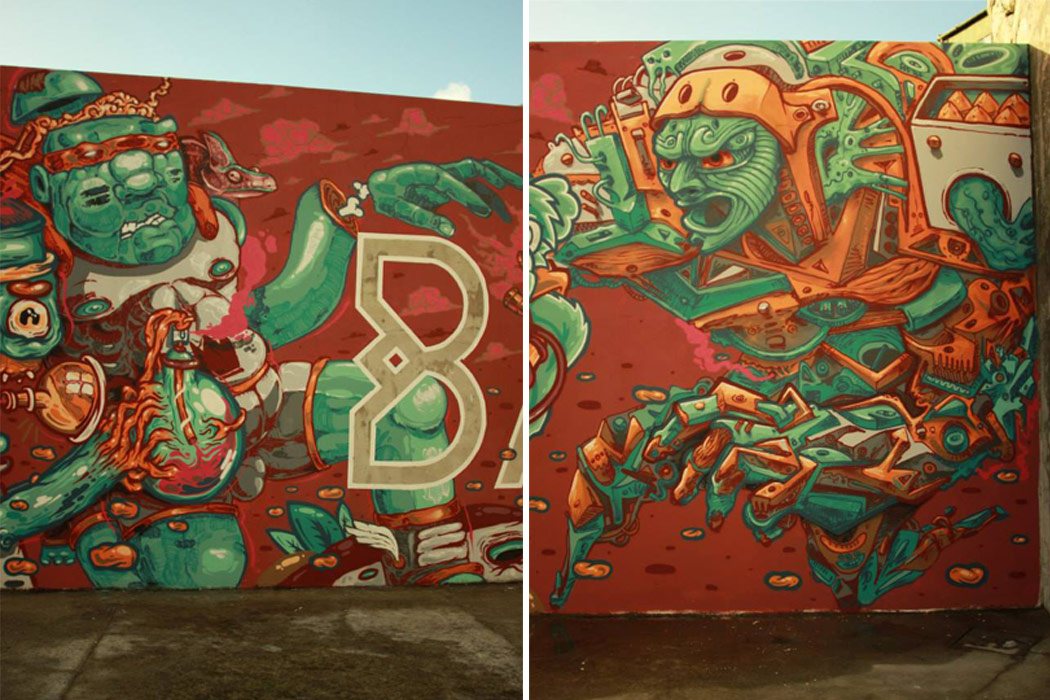 A beautifully crafted wall for the EspaçoBALA, in Porto, thanks to the artists Oker, Fedor, Mesk & Mots. A great composition both in colours as in styles, depicted in this piece.