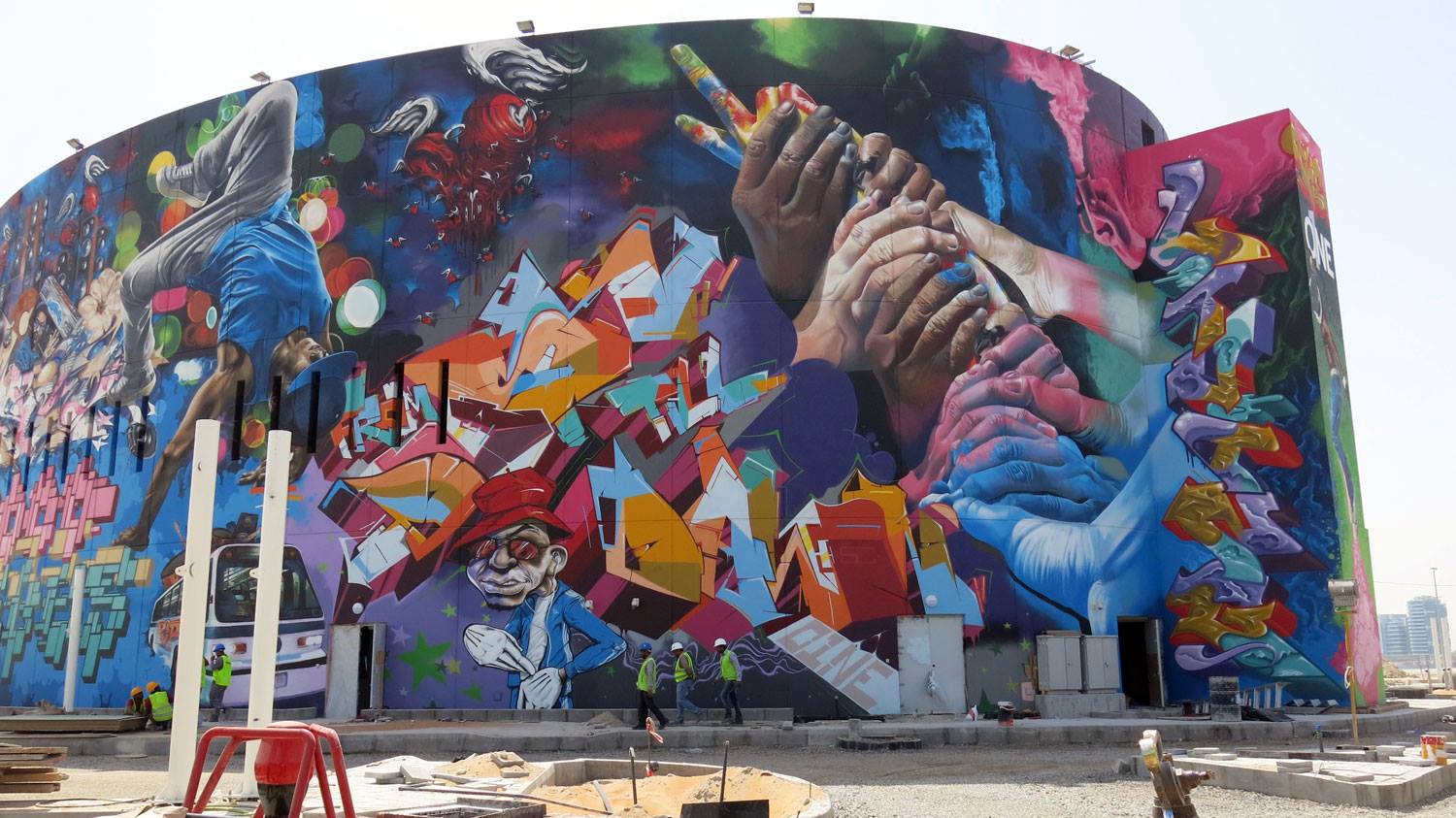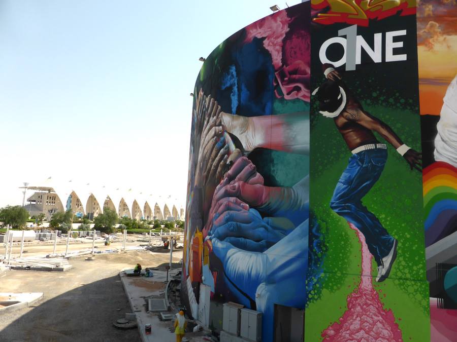 The “O1NE” Project brought together 18 international artists through 14 intense nights (due to extreme heat) of work around a 3000m² building in Yas Island (Abu Dhabi), making it the biggest privately owned graffiti piece in the world, just about to make the Guinness World Book of Records. Amongst the role of artists was MrDheo, together with Beyond, Bonzai, Case, Does, Fins, Karski, Koan, Miel, MrWany, Nase, Nash, Roid, SatOne, Swk, Tasso, Telmo, Treze and Zeds.