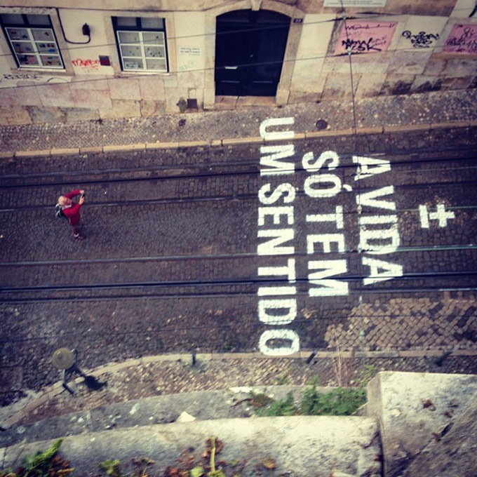 A new piece has been up in Lisboa (and most likely already taken down), from MaisMenos. It reads “Life has only one meaning/way”, placed on the tracks of the Sta Glória lift which goes up and down the ramp all day.