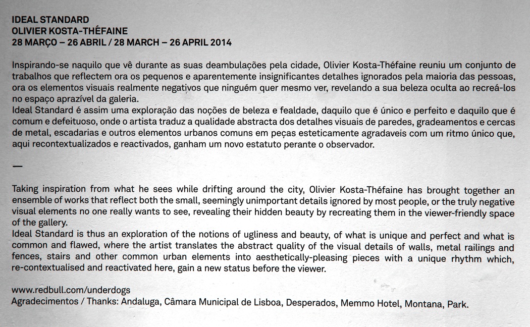 Olivier Kosta-Théfaine latest solo show “Ideal Standard” has just finished at the Underdogs gallery, but we’re leaving you with a glimpse of what went on display for the past month. An exhibition that drifts away from what you’re used to see at the Underdogs gallery, and immerses you on the conceptual pieces that Olivier has brought from the details and visual elements found around the city, brought into the gallery.