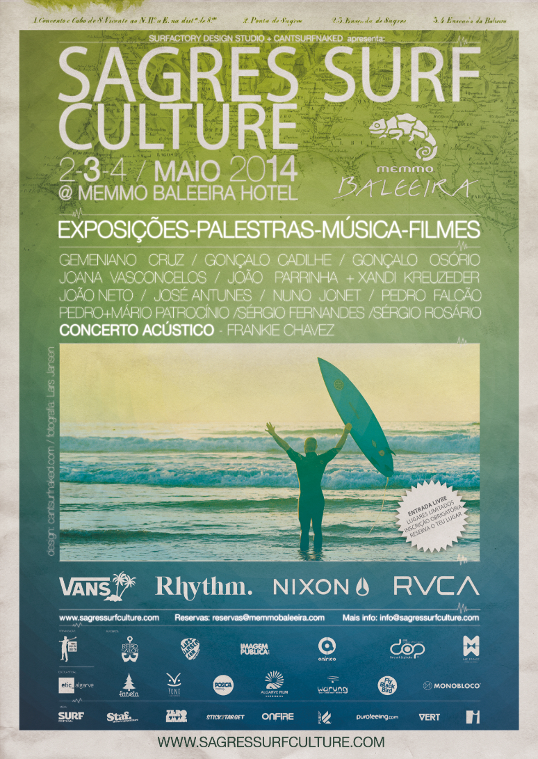 Está de volta o Sagres Surf Culture 2014. A terceira edição do evento que reúne a nata da cultura de surf do nosso país está marcada para os dias 2, 3 e 4 de Maio, e volta a ter como cenário o design hotel Memmo Baleeira, em Sagres, para dar palco aos que se inspiram no mar e nas ondas para o seu trabalho artístico.