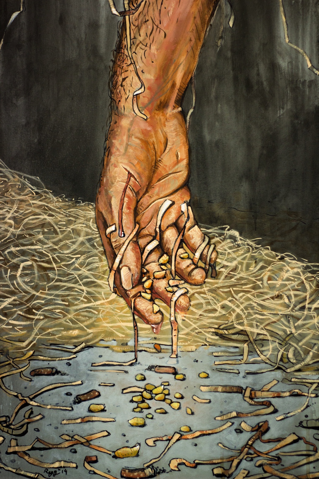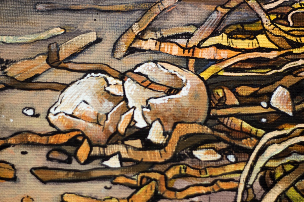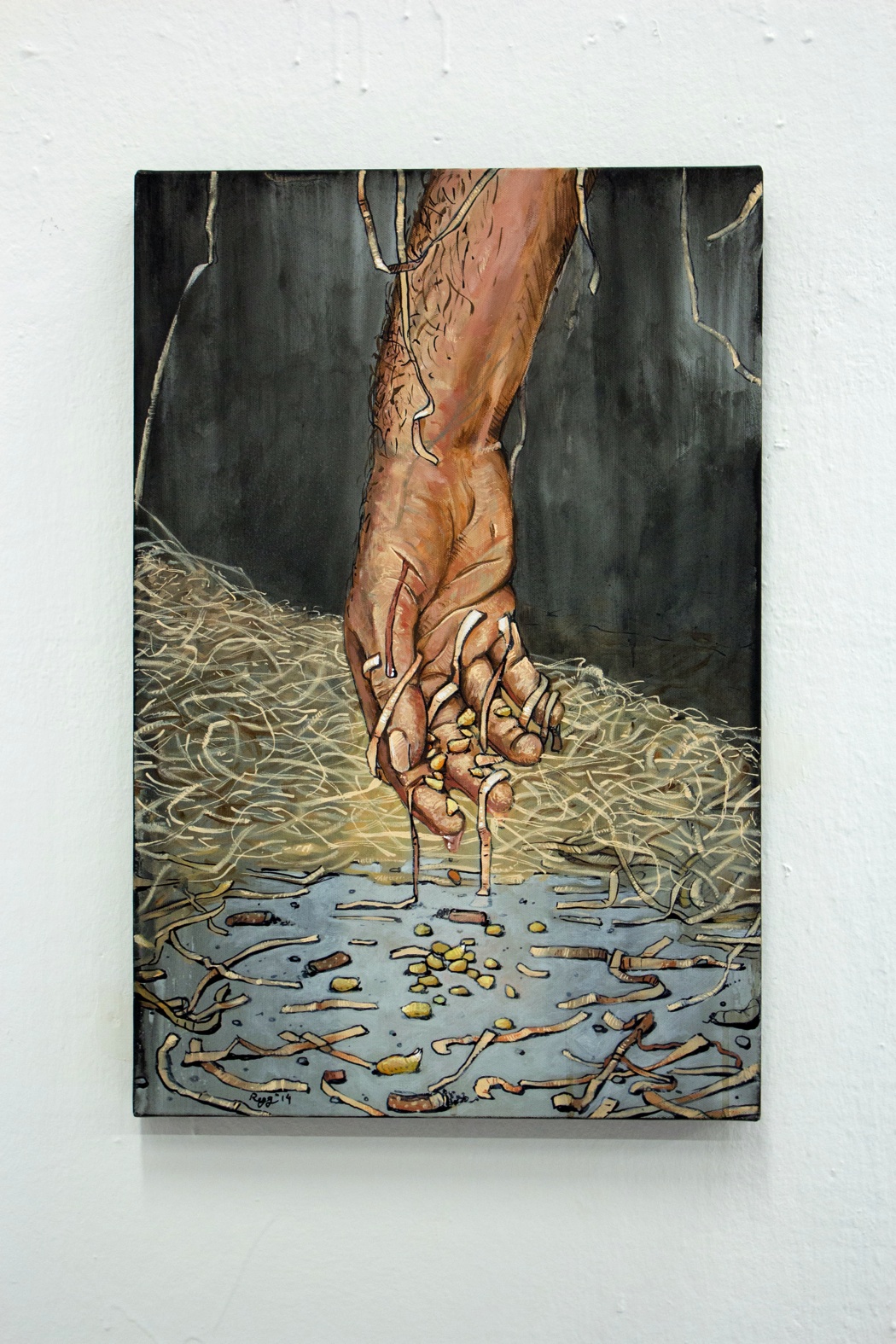 Montana Shop & Gallery latest show by Regg entitled “Needles in a haystack” is now live and in case you missed it, we got you covered. The decorated room, the dark tones with loose brush strokes and the different mediums over which he operated, set the mood to this show thematics.