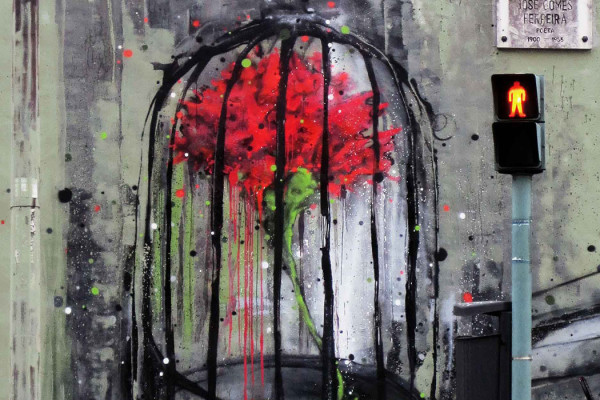 New piece by Bordalo II about the 1974 revolution in Portugal, depicting a carnation flower (the symbol of the revolution) behind bars, around Campo…